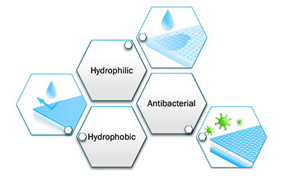 Specialized finishes engineered for nonwoven fabrics. Our treatments deliver essential performance, including moisture management (Hydrophilic), advanced hygiene (Antibacterial), and effective liquid barrier protection (Hydrophobic).